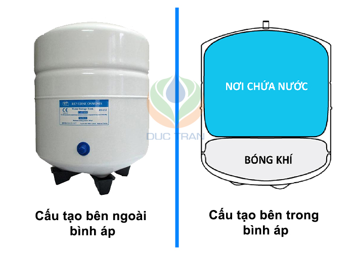 Bình áp máy lọc nước RO có cấu tạo đơn giản gồm ba bộ phận chính: bóng cao su, bóng chứa nước và vỏ bình. Bên trong bình áp là một không gian rỗng, bên dưới là bóng cao su có chứa khí, bên trên là bóng dùng để chứa nước sau khi lọc. Vỏ bình thường được làm từ nhựa hoặc hợp kim cao cấp an toàn cho sức khỏe con người.