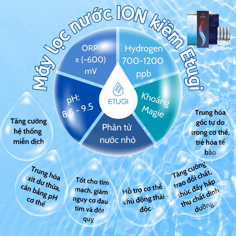 - Giảm nguy cơ mắc bệnh: Một số nghiên cứu cho thấy nước ion kiềm có khả năng hỗ trợ phòng ngừa một số bệnh mãn tính như tiểu đường, ung thư và bệnh tim mạch.