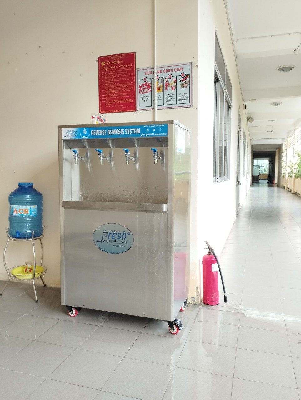Máy lọc nước RO được đặt tại các khu vực như phòng học, văn phòng giáo viên hoặc khu nhà ăn, giúp cung cấp nước uống trực tiếp.
