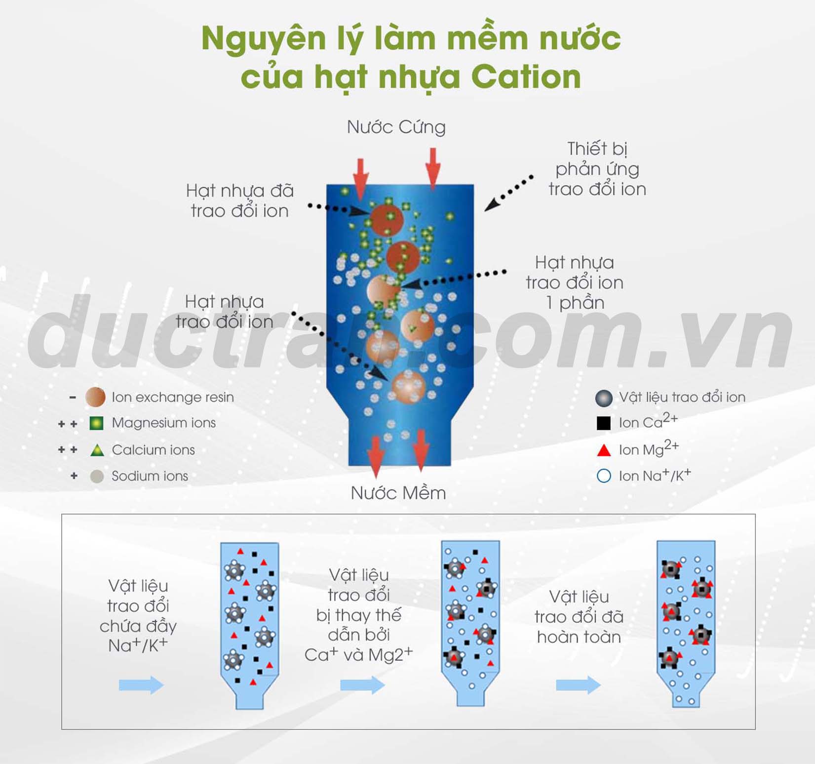 - Thường dùng loại hạt nhựa cation để làm mềm nước.
