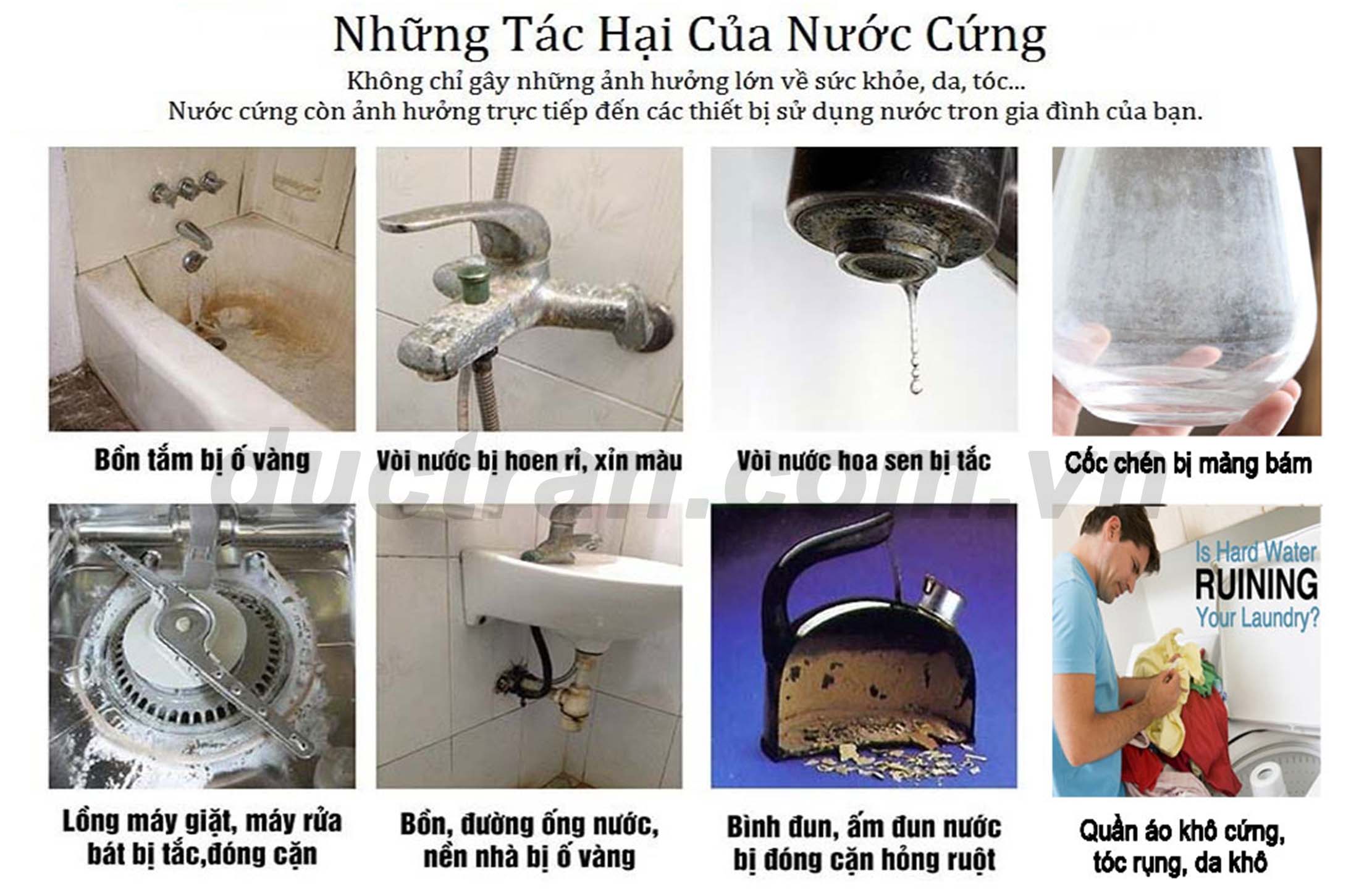 - Tác hại: đóng cặn trong thiết bị sinh hoạt và gia dụng, giảm tuổi thọ máy móc và thiết bị, bám cặn đồ dùng, xỉn màu quần áo.
