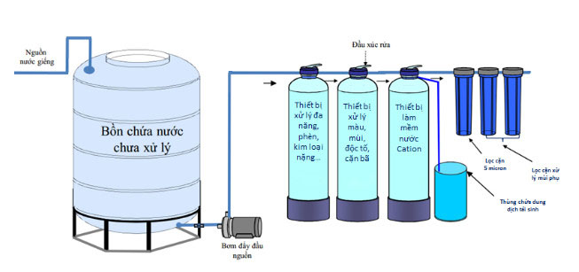 Bước này là phần xử lý thô nguồn nước đầu vào: nước được đẩy lên hệ thống nhờ bơm tăng áp đẩy cao đẩy vào bồn chứa nước chưa xử lý (thường là nước máy, nước giếng). Sau đó tuỳ theo công suất nước xử lý và nguồn nước đầu vào đang ở tình trạng nào: vàng đục, phèn, cặn, mùi,…để sử dụng số cột và công suất phù hợp. Trên mõi cột lọc này sử dụng van khoá, thường sẽ dùng loại van cơ vì nó có ưu điểm dễ vận hành, dễ sửa chữa thay thế khi bị hư hỏng cùng với mức kinh phí phù hợp hơn là các loại van khoá tự động. Thùng muối chứa dung dịch tái sinh giúp làm mềm nước nên khi vận hành hệ thống, kiểm tra định kỳ 1 lần/ ngày tái sinh. Trước khi cho vào bồn chứa trung gian, bộ lọc ba lõi lọc cặn và khử mùi sẽ giúp lọc hoàn toàn cặn và giúp xử lý nước được đảm bảo chất lượng đầu ra tốt nhất.
