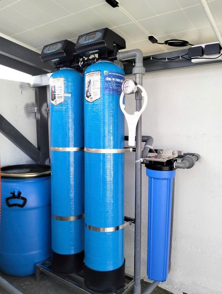 Hệ thống khung giá inox 304, tủ điện, thùng muối hoàn nguyên của hệ thống.