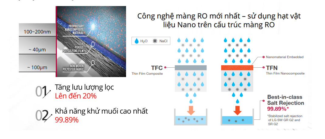 Công nghệ cấu trúc vật liệu nano TFN (Thin Film Nanocomposite) là công nghệ nền tảng được ứng dụng trong tất cả các màng RO của NanoH,O. Công nghệ này mang lại những ưu điểm nổi bật: