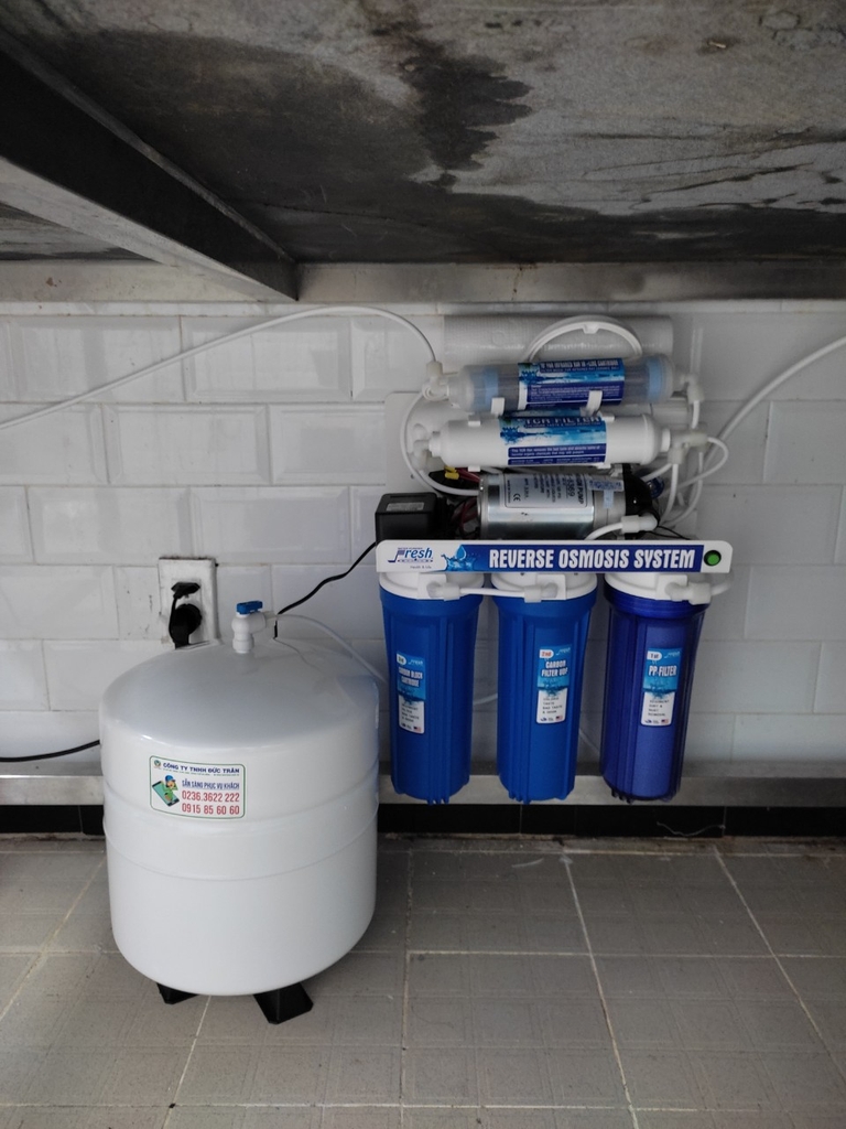 Máy lọc nước RO Fresh 50 lít/h bầu 10" 6 lõi lọc với thiết kế không tủ, thích hợp cho các gia đình có không gian chật hẹp, máy có thể treo tường, lắp gầm tủ, để bàn,...