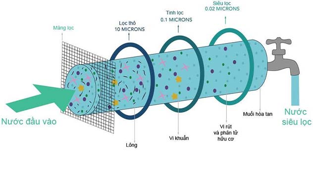 Màng lọc UF có kích thước lỗ khoảng 0,01 micron, cho phép nước và các ion nhỏ đi qua nhưng giữ lại các vi khuẩn, ký sinh trùng và các tạp chất lớn hơn. Quá trình này diễn ra dưới áp lực nước tự nhiên, không đòi hỏi năng lượng như hệ thống RO.
